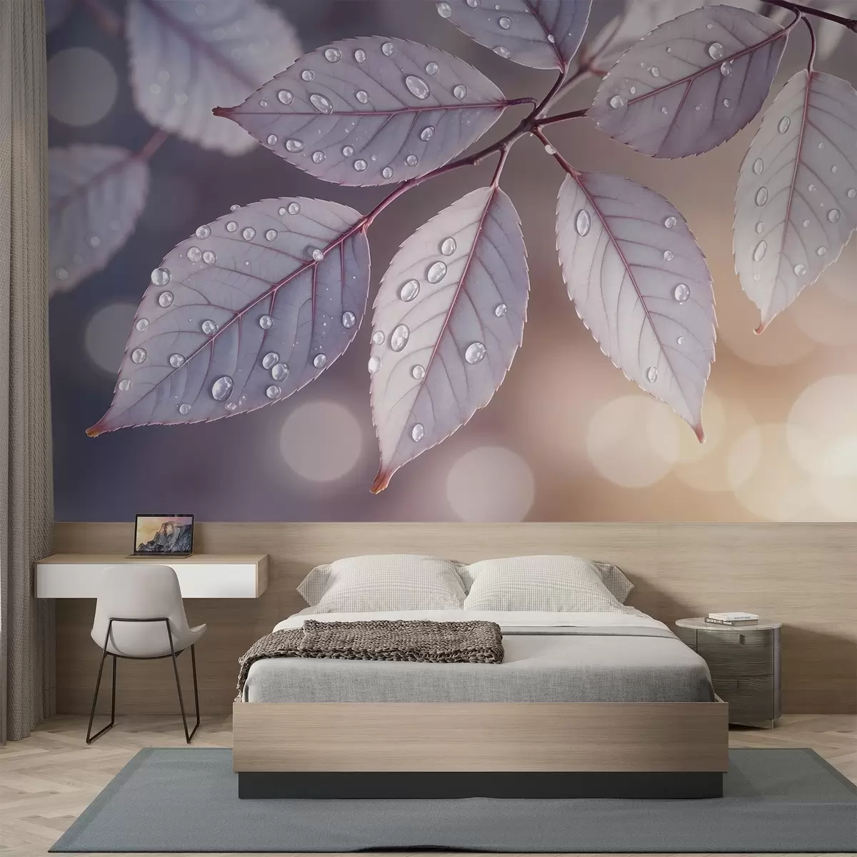 Fototapet Delicate frunze violet cu picături de apă, fundal de focalizare moale Nr. w08419