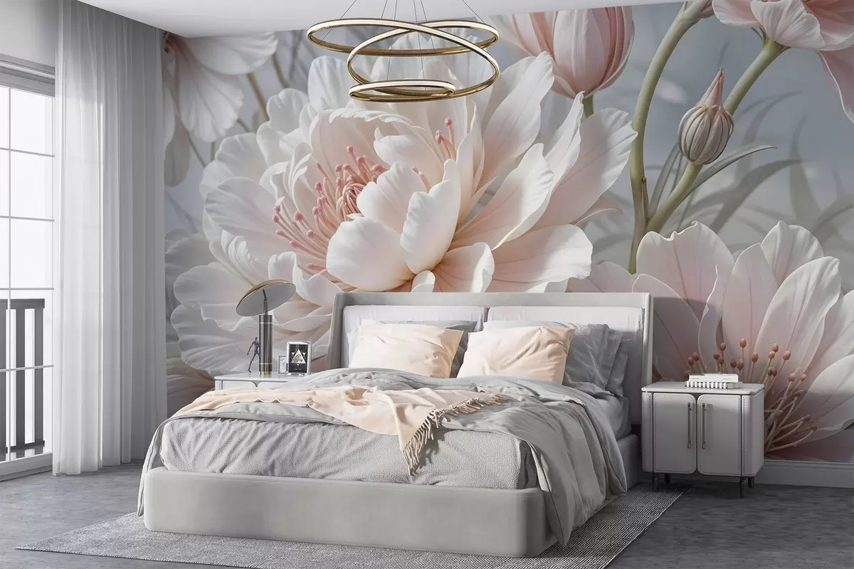 Fototapet Flori de bujor mari, delicate, albe și roz, cu petale moi, pufoase, pe un fundal gri neclar Nr. w08427