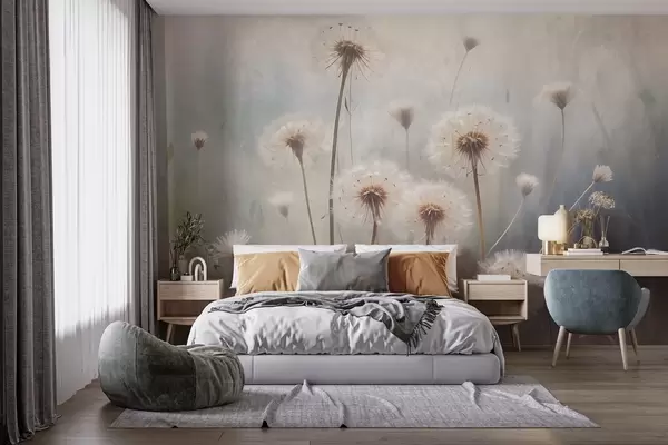 Fototapet Focalizare moale flori de păpădie într-un câmp, cu un fundal neclar pastel colorat texturat Nr. w08432