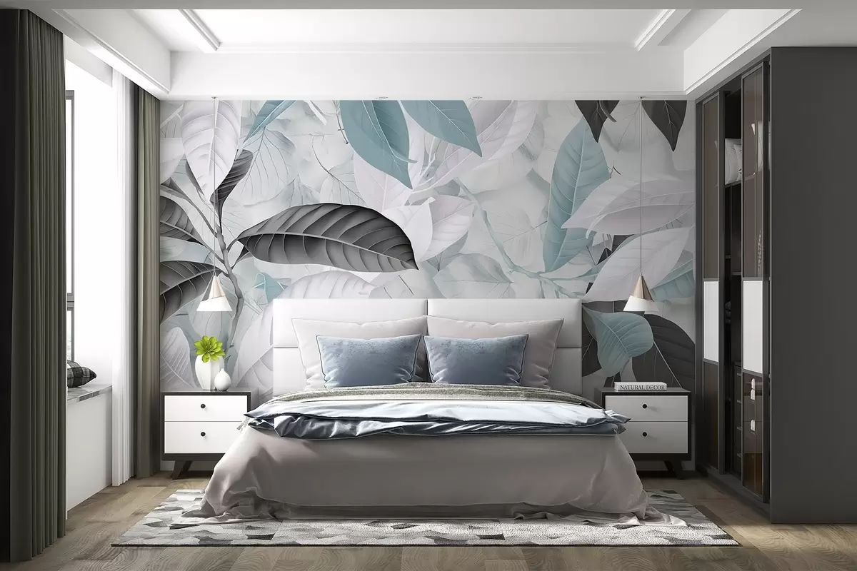 Fototapet Imprimare mare de frunze albastre și gri pe un fundal texturat de frunze ușoare, creând o senzație tropicală luxuriantă Nr. w08468v1