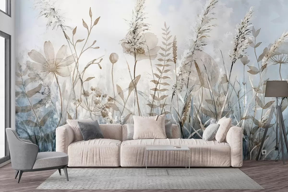 Fototapet Un câmp de iarbă înaltă, frunziș natural și plante cu texturi moi, rarefiate, pe un cer cețos, acoperit de nori Nr. w08472