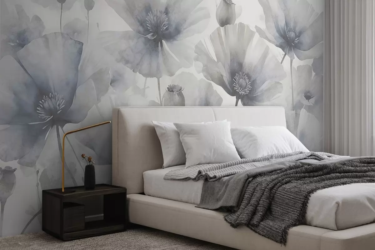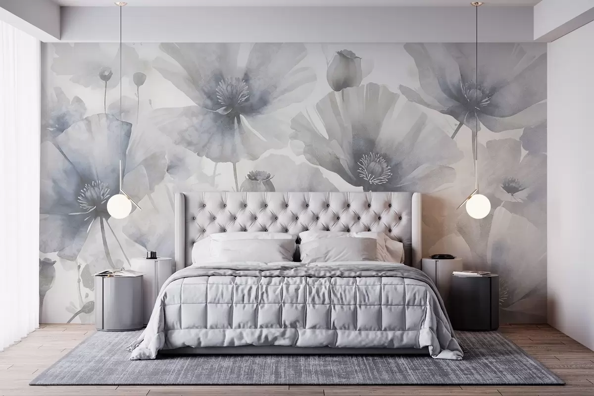 Fototapet Delicate texturale grunge gri și flori albe cu petale moi, neclare pe un fundal alb Nr. w08526