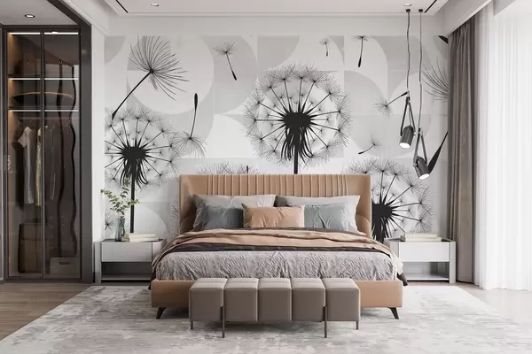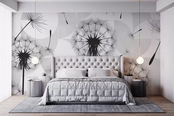 Fototapet Flori de păpădie albe și negre cu capete de semințe pufoase pe un fundal textural alb și gri deschis Nr. w08529