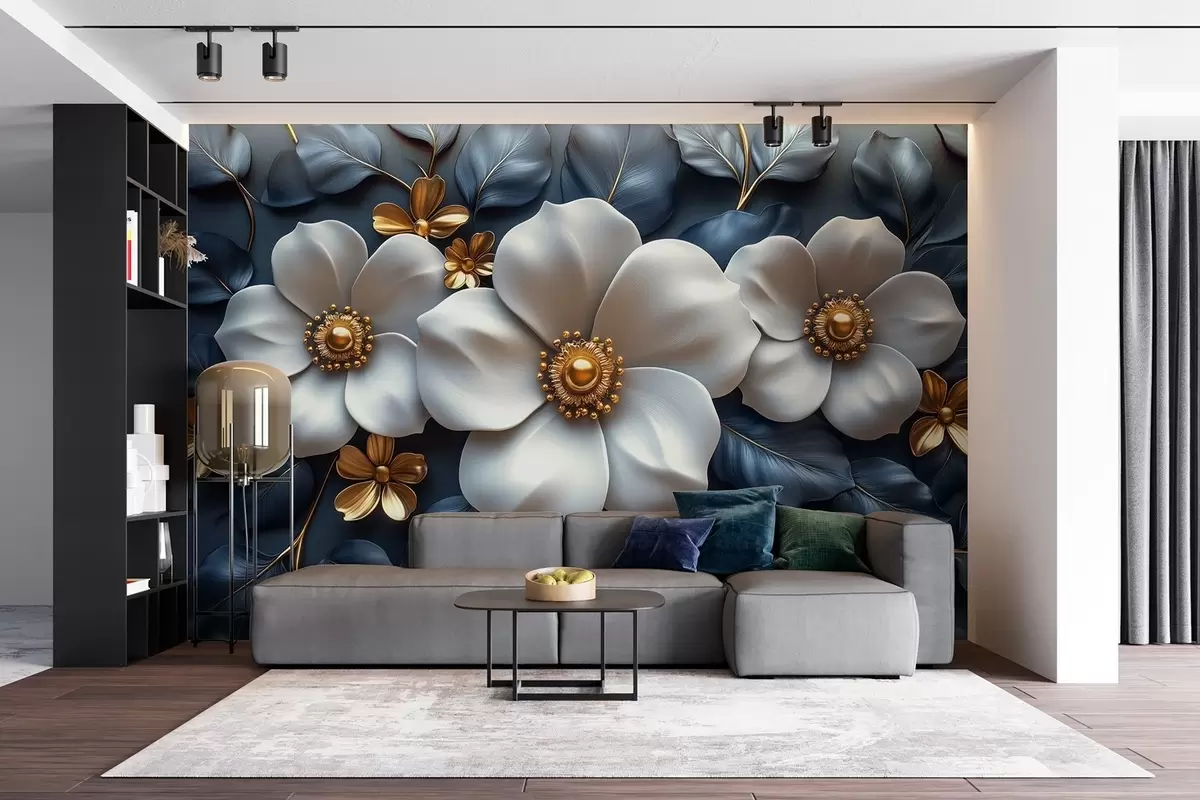 Fototapet Flori albe mari pe un fundal albastru elegant cu frunze Nr. w08559