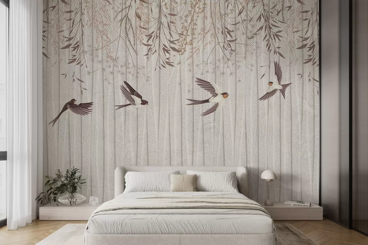 Fototapet Păsări zburătoare pe un fundal texturat cu păpădii și flori Nr. w08566