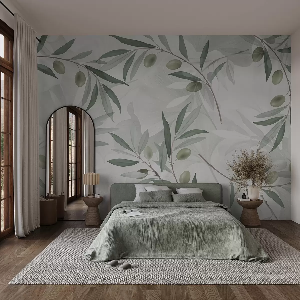 Fototapet Ramuri de măslin cu frunze verzi și măsline pe un fundal deschis Nr. w08576
