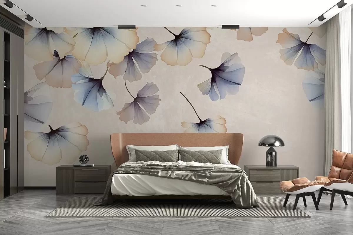 Fototapet Frunze de ginkgo în culori pastelate, albastre și bej, cu petale delicate plutind în aer pe un fundal texturat Nr. w08578