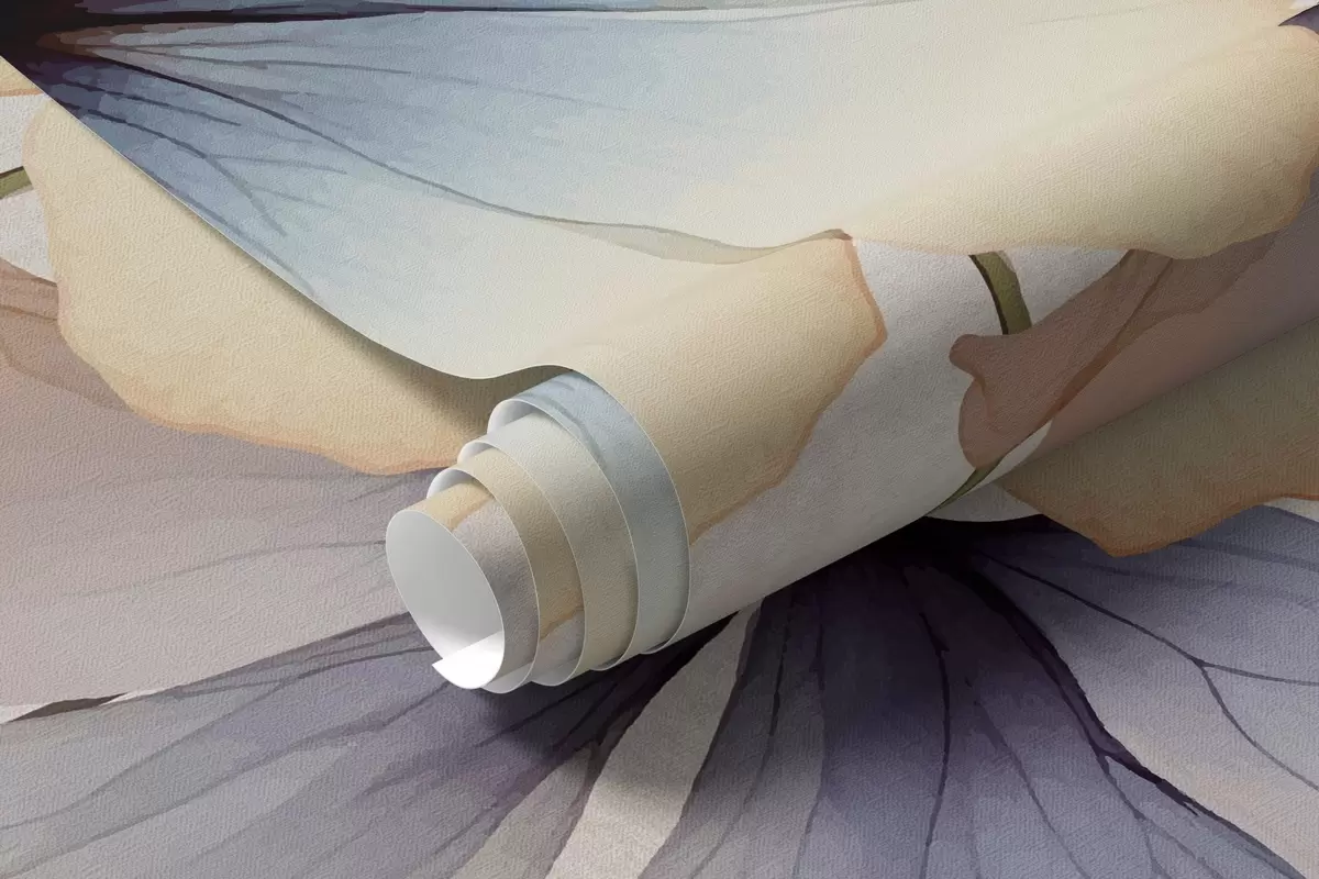 fototapet Frunze de ginkgo în culori pastelate, albastre și bej, cu petale delicate plutind în aer pe un fundal texturat w08578