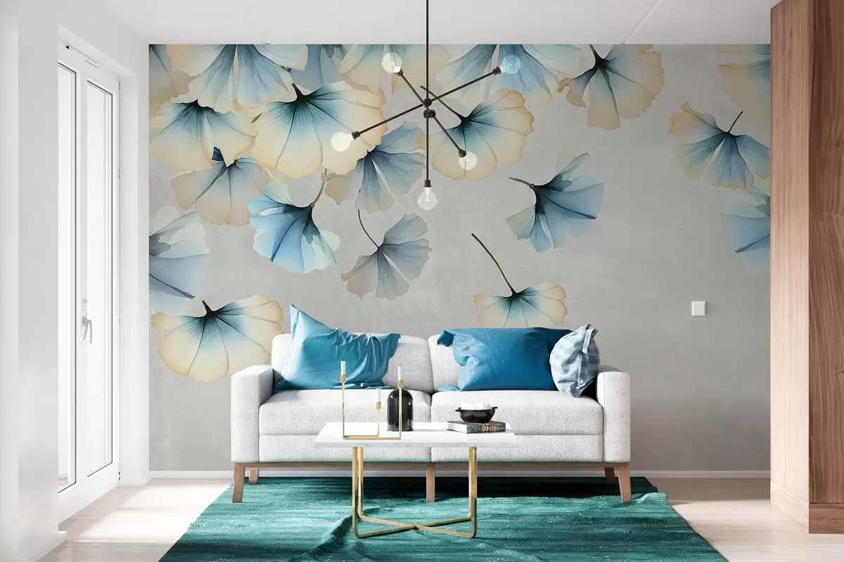 Fototapet Frunze de ginkgo în culori pastelate, albastre și galbene, cu petale delicate plutind în aer pe un fundal textural Nr. w08578v1