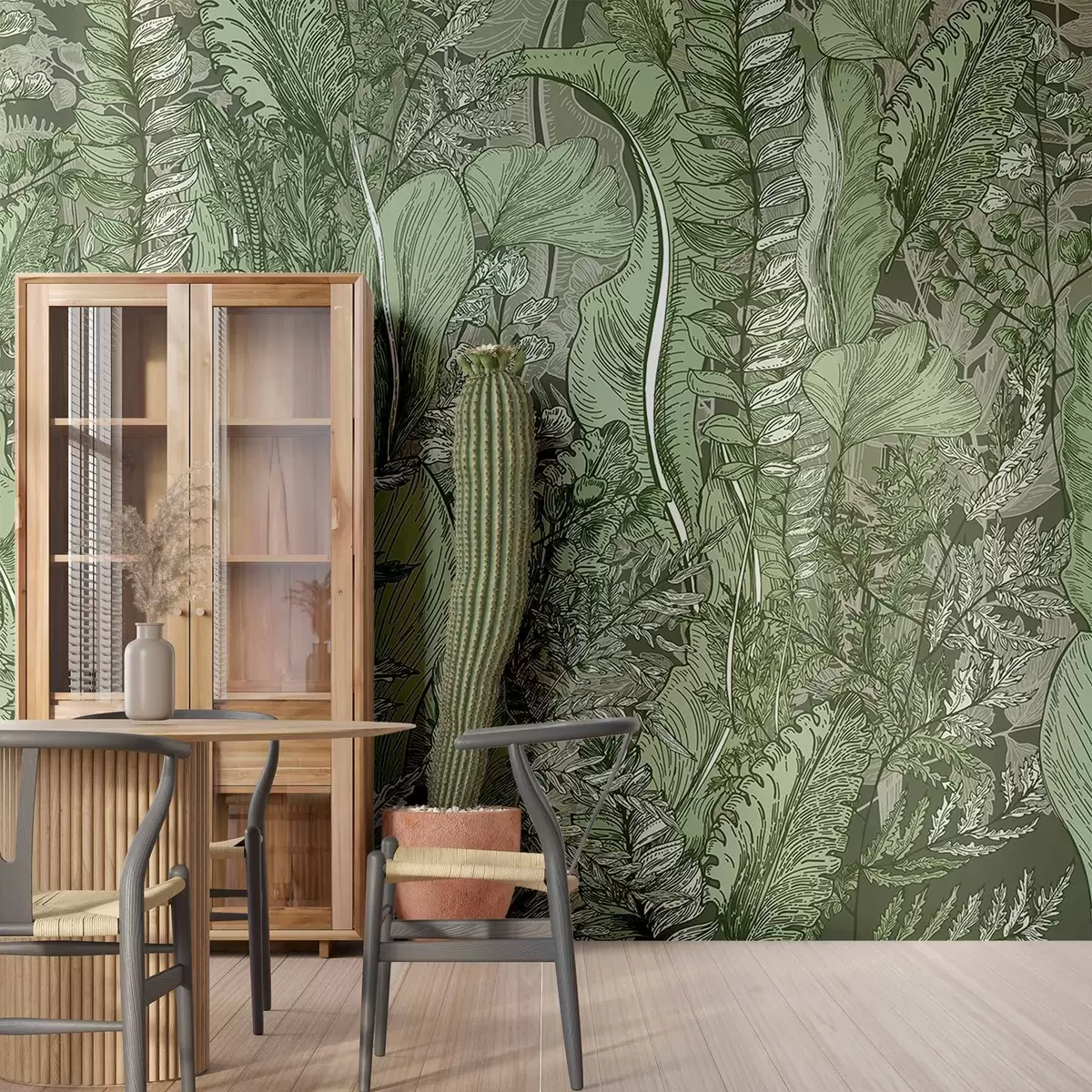 fototapet O pădure luxuriantă, verde, cu diferite tipuri de ferigi, frunze și frunze în nuanțe de verde  w08579