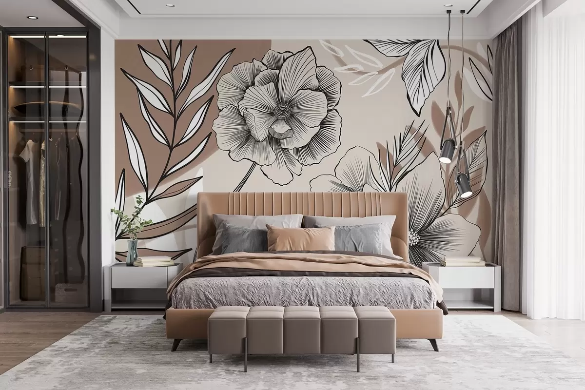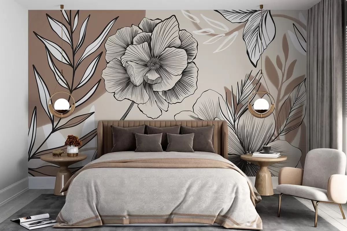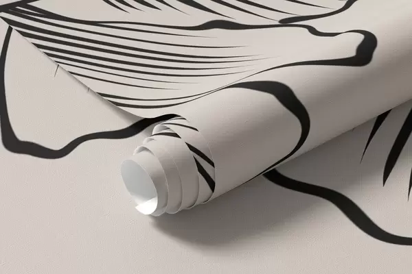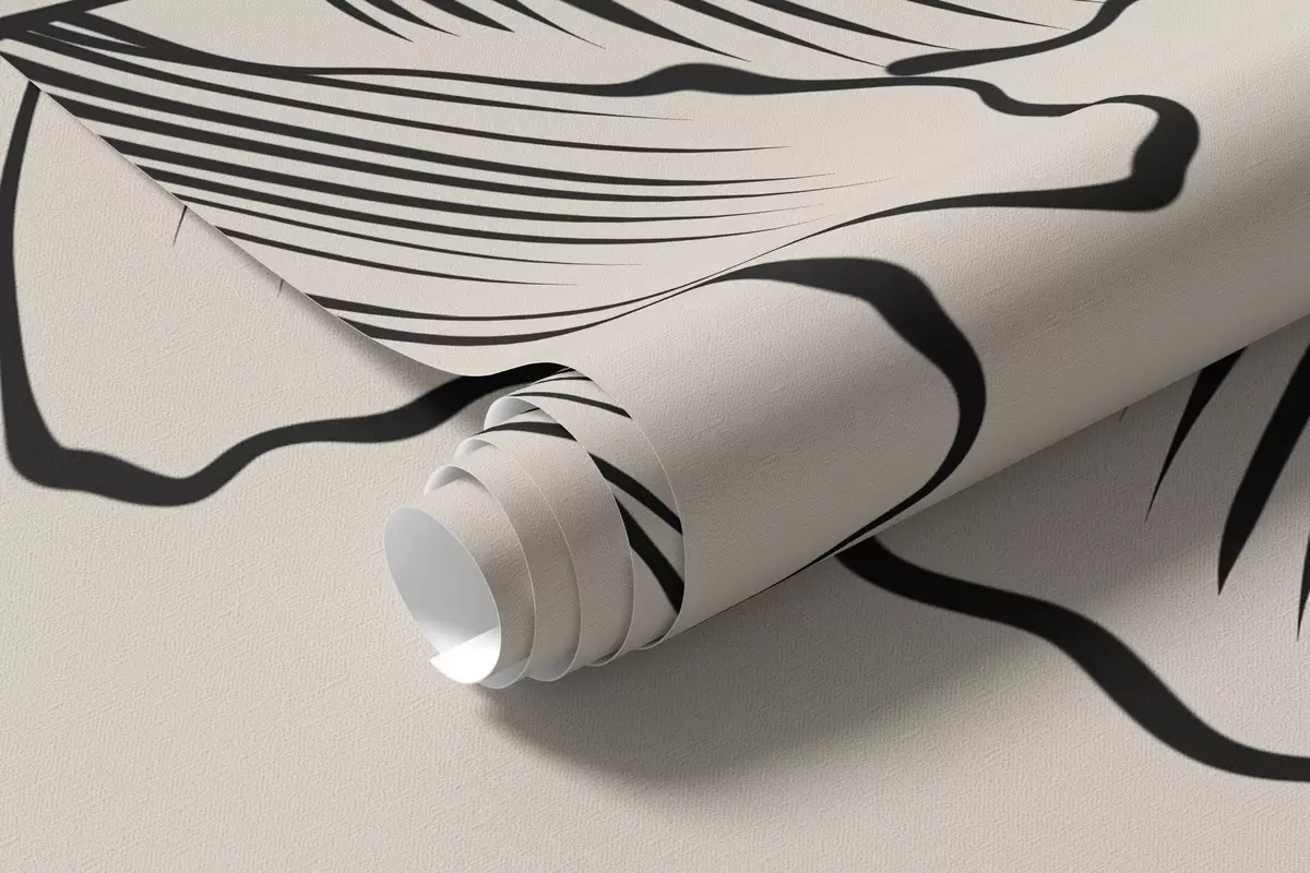 Fototapet Flori grafice mari alb-negru cu frunze detaliate pe un fundal abstract bej Nr. w08580