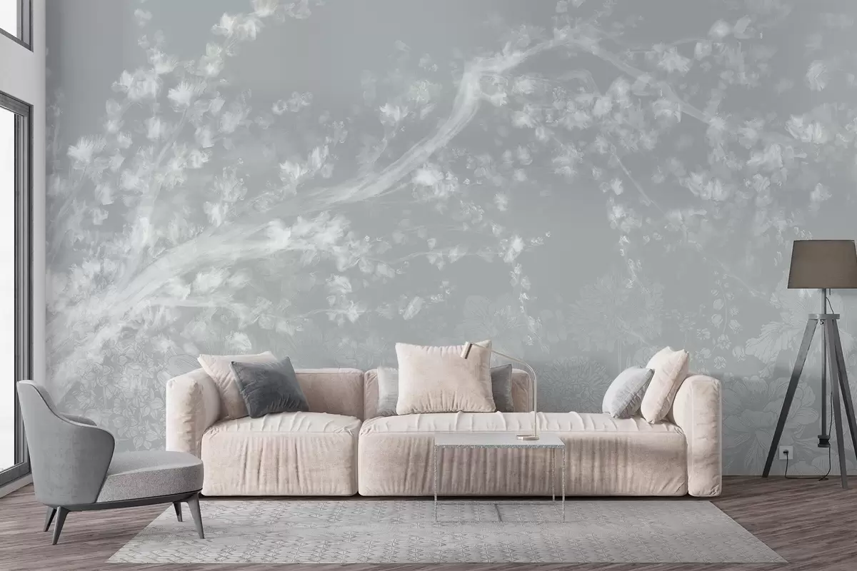 Fototapet Imprimare neclară, out-of-focus cu un alb hazy ramuri de copac cu fundal floral lumina moale Nr. w08581