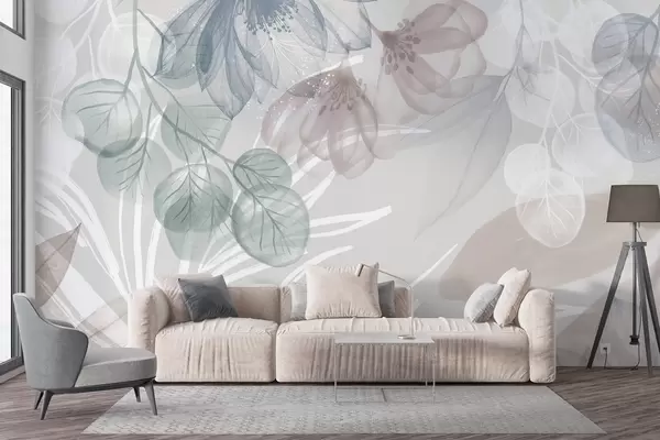 Fototapet Imprimeu floral în culori pastelate cu flori și frunze abstracte mari transparente în nuanțe de gri, roz și verde Nr. w08600