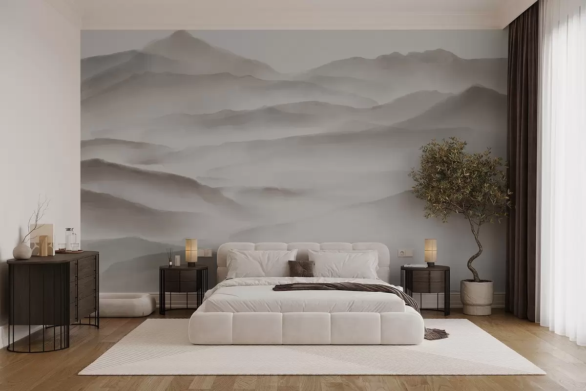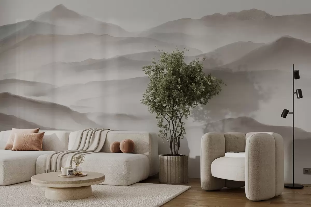 Fototapet Peisaj montan minimalist cu dealuri ondulate și ceață, creând o imprimare senină și atmosferică Nr. w08602