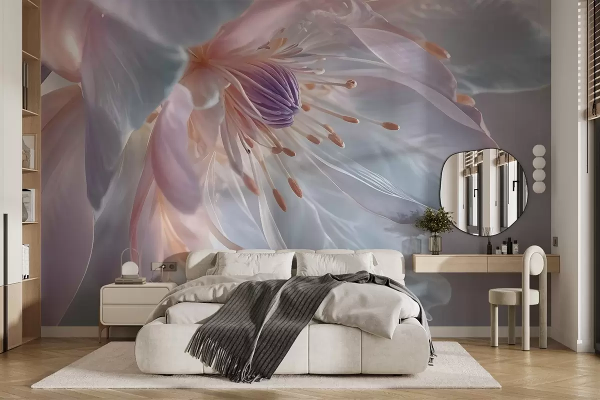 Fototapet Un prim-plan al unei flori delicate, de culoare pastel, cu petale moi, translucide și un centru vibrant Nr. w08605