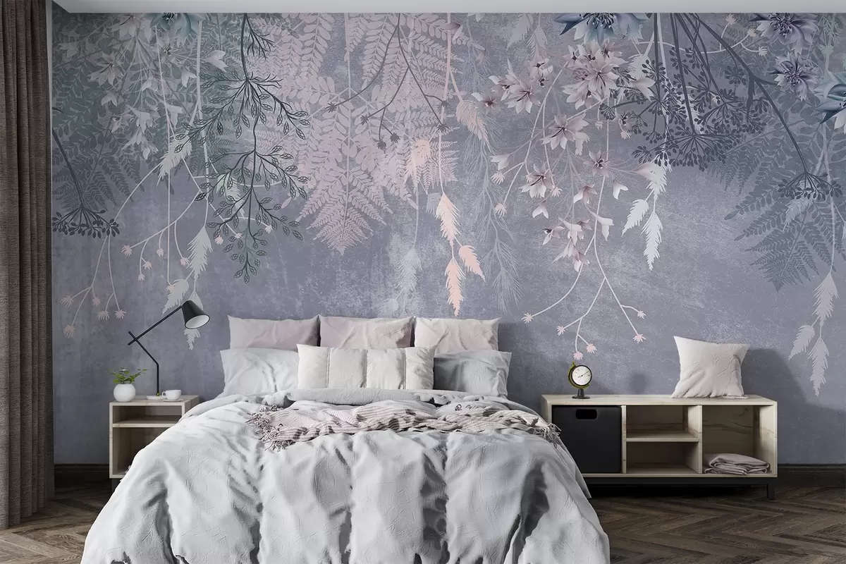 Fototapet Un vis, plante delicate, wispy, spikelets și flori în culori pastelate albastru pe un fundal cețos, texturat Nr. w08606