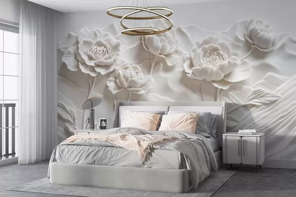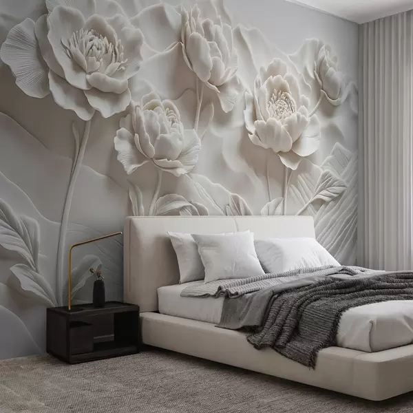 Fototapet O imitație florală albă de sculptură în relief cu flori mari de bujor detaliate pe un fundal simplu Nr. w08612