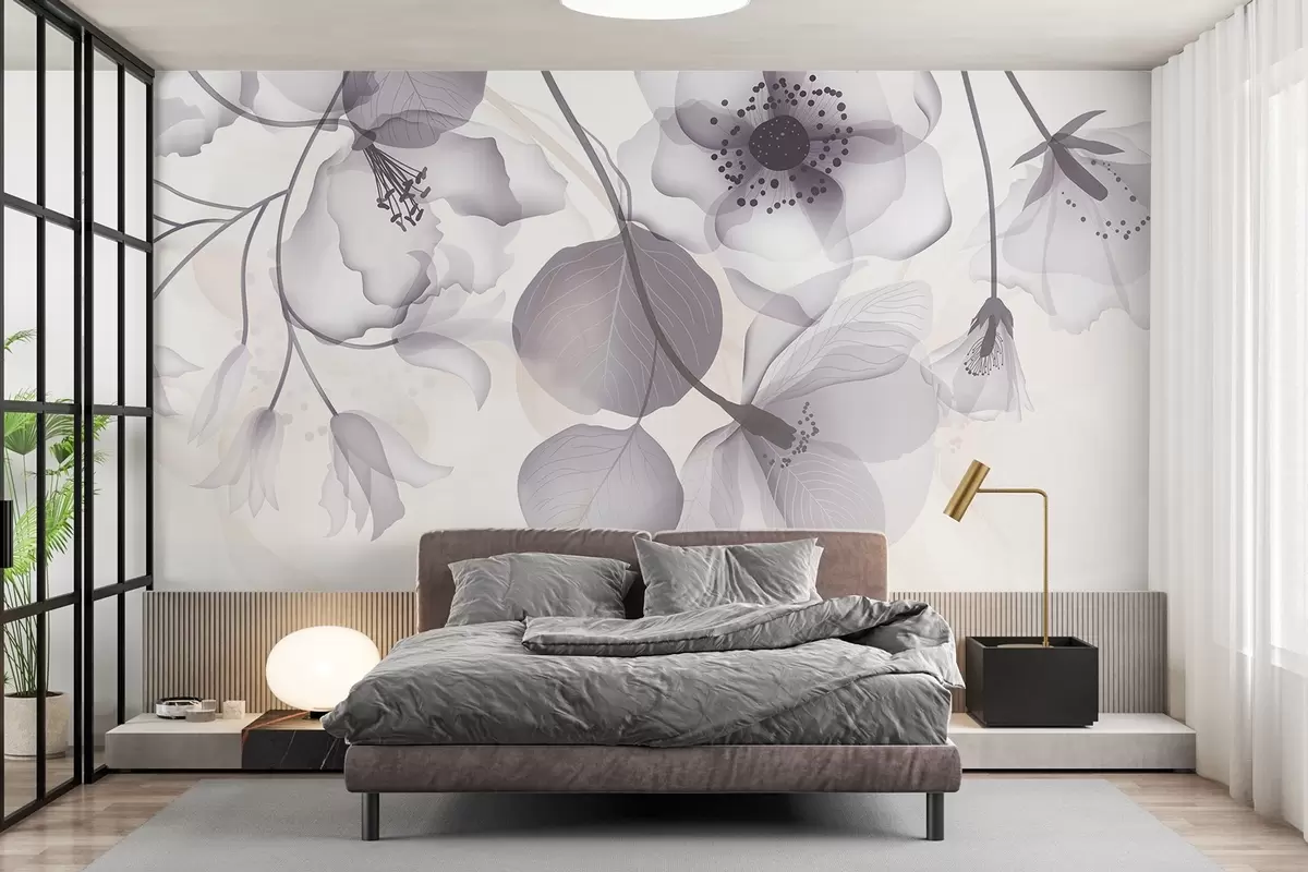 Fototapet Delicate flori translucide gri și bej, cu petale moi și centre întunecate, pe un fundal deschis Nr. w08613v2