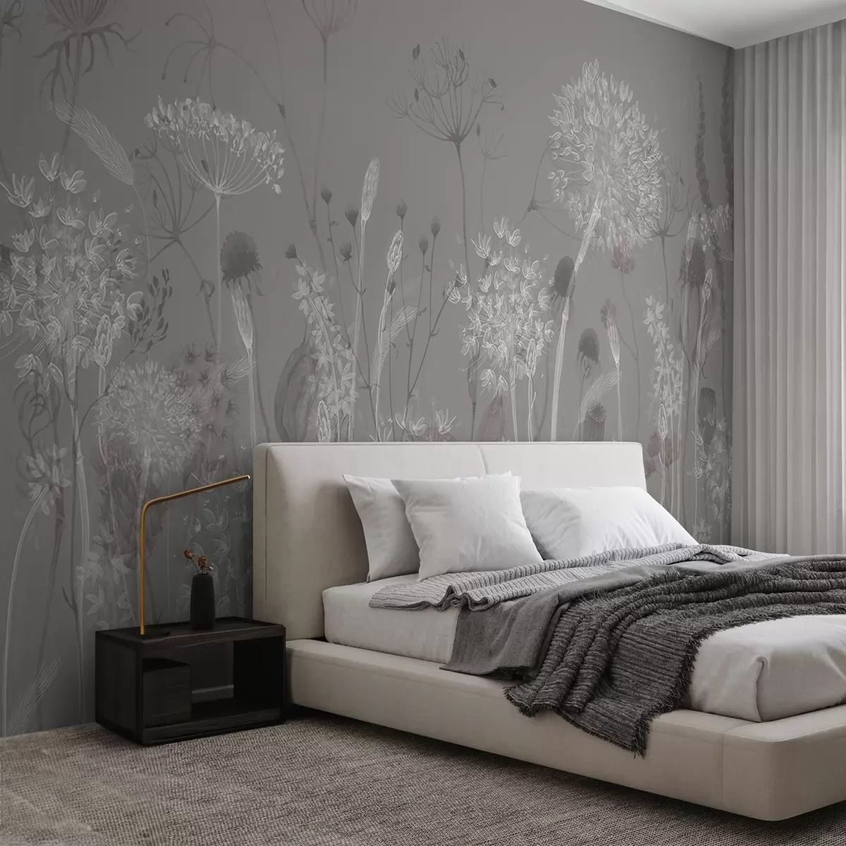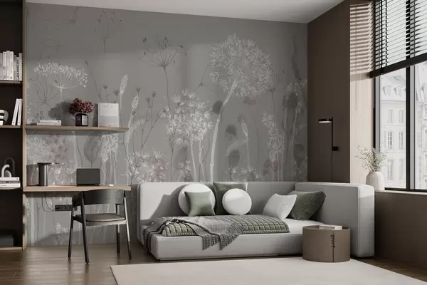 Fototapet Păpădii aerisite și flori sălbatice în stil acuarelă în tonuri albastru-cenușiu Nr. w08637v3