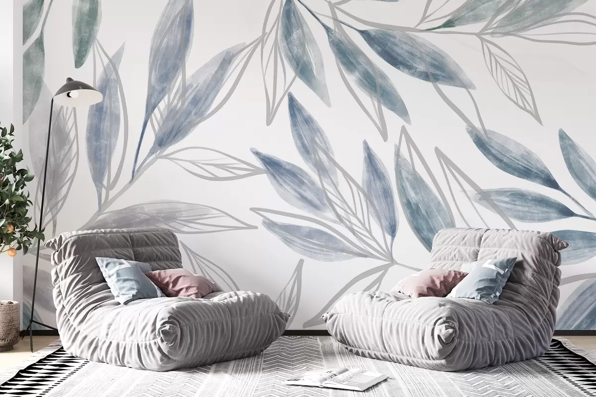 Fototapet Delicate albastru și gri frunze pastelate texturate , creând o compoziție botanică senină și minimalistă Nr. w08642v1