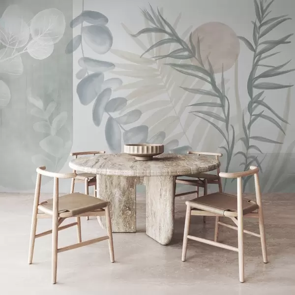 Fototapet O imprimare abstractă minimalistă cu frunze stilizate și eucaliptus cu forme organice moi, albastre, în culori pastelate atenuate Nr. w08648v1