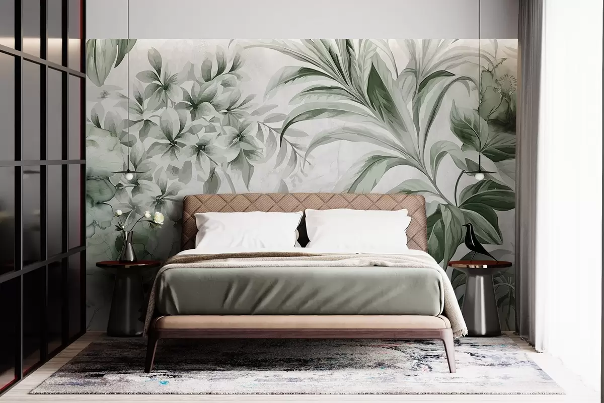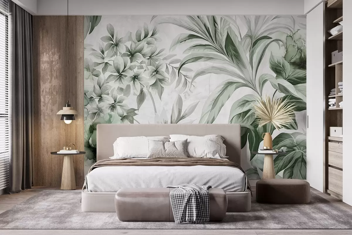 Fototapet Frunze tropicale și frunze într-o paletă atenuată, variind de la nuanțe deschise la nuanțe închise de verde pe un fundal ușor texturat Nr. w08650