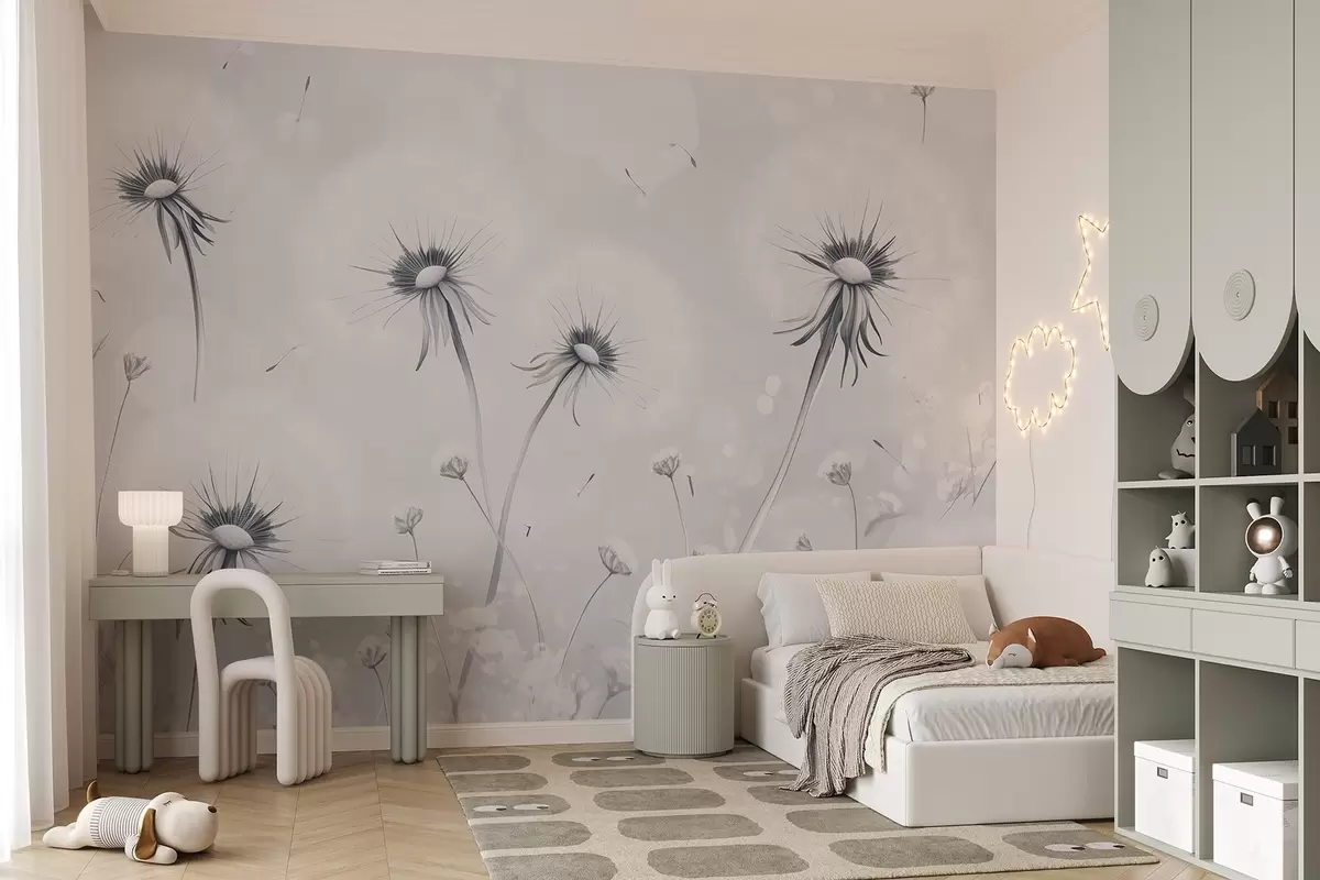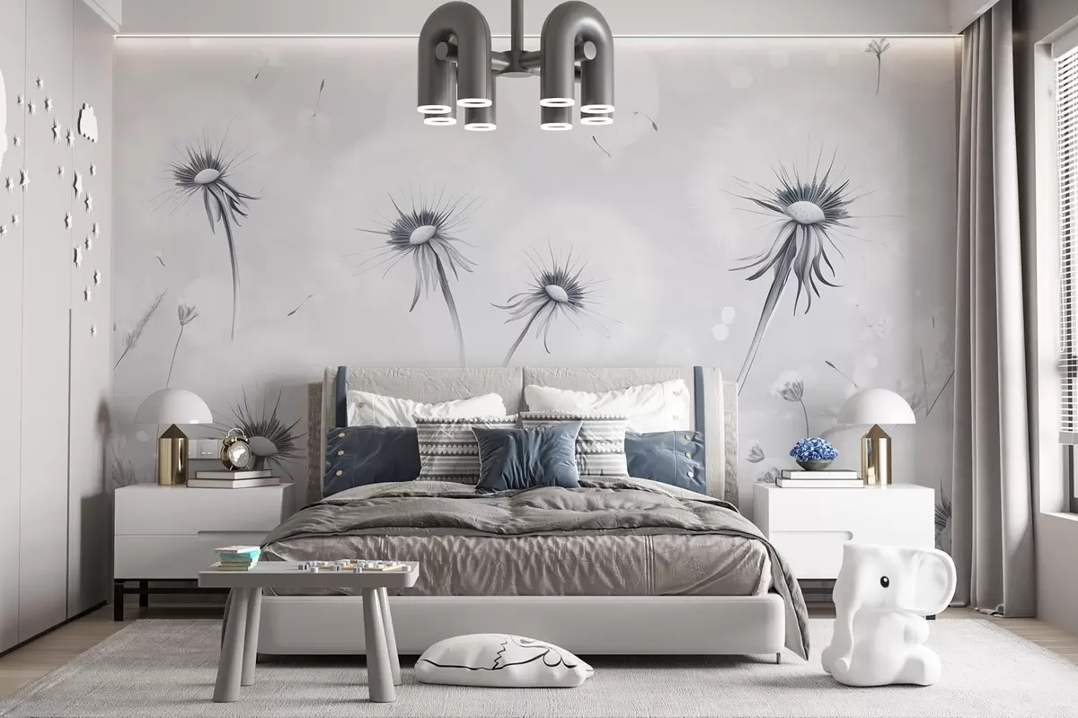 Fototapet Păpădii elegante și flori sălbatice în stil pictură în tonuri de albastru Nr. w08657v2