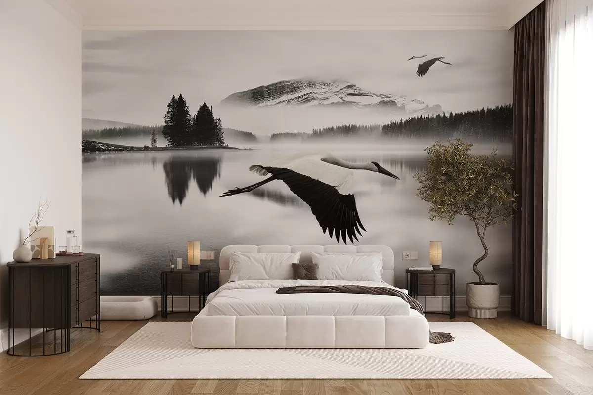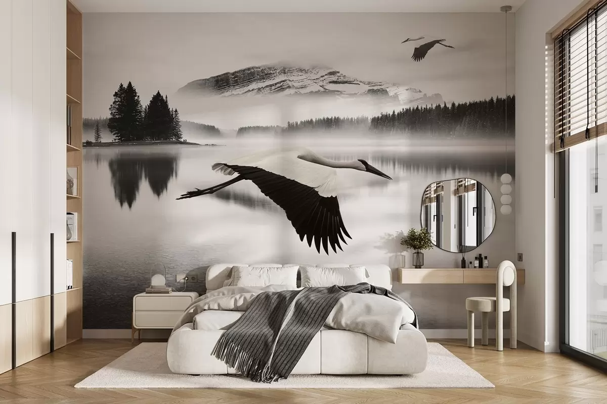 Fototapet O barză în zbor peste un râu și munți, peisaj alb-negru cu păsări Nr. w08658
