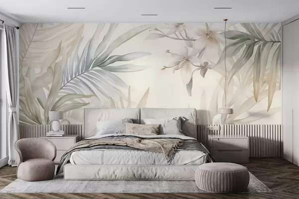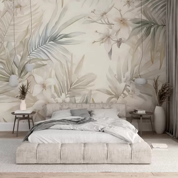 Fototapet Frunze și flori tropicale în culori pastelate, cu verde deschis, crem și roz subtil Nr. w08660