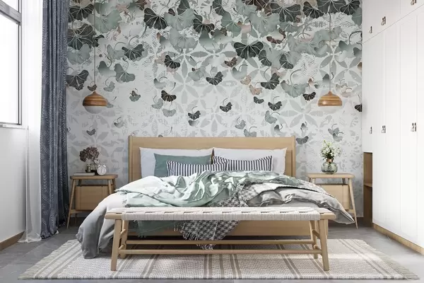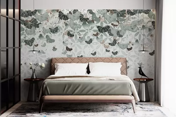Fototapet Frunze de ginkgo în cascadă în nuanțe de verde și maro, pe un fundal texturat cu motive florale Nr. w08662