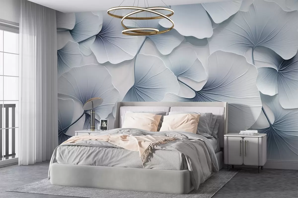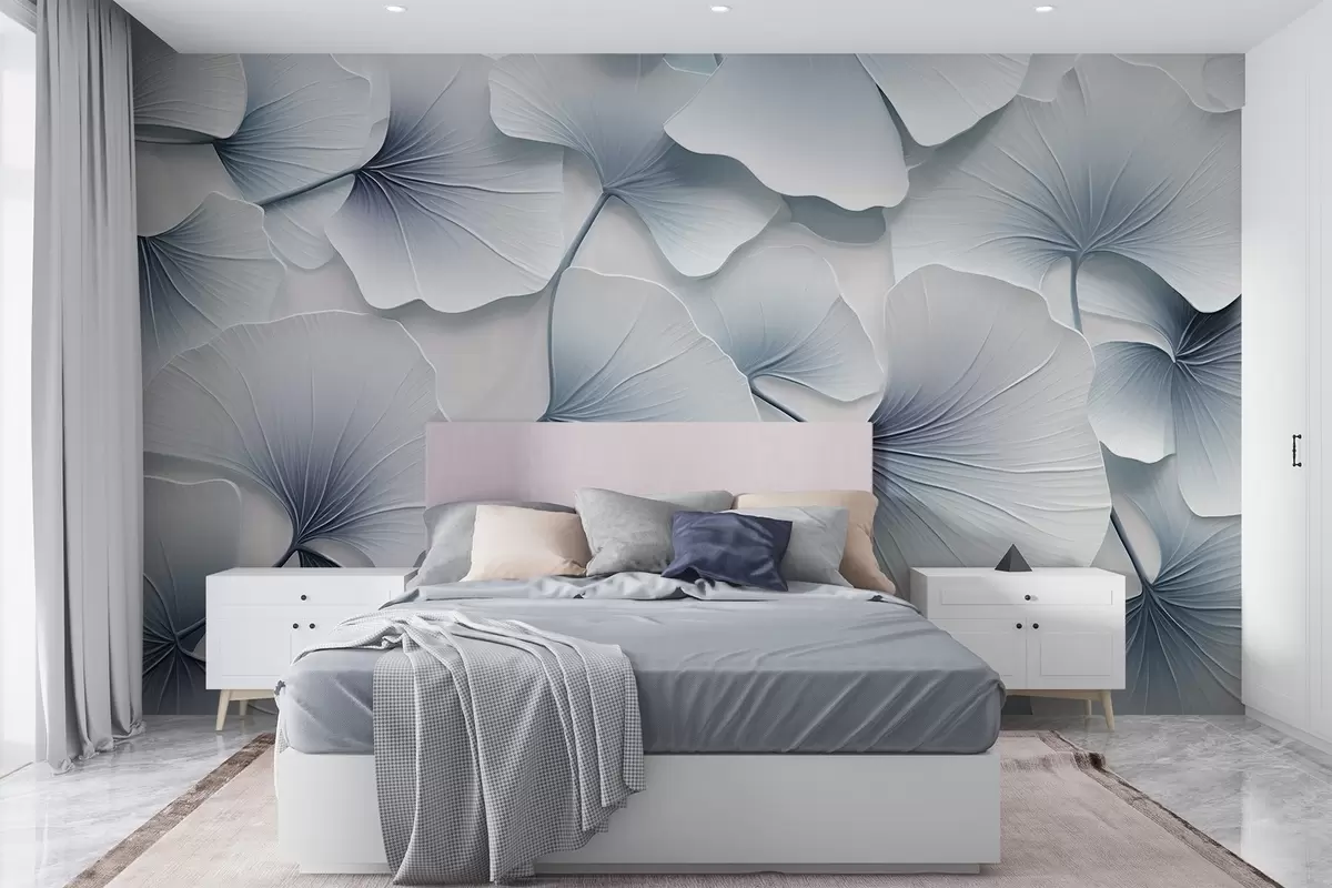 Fototapet Frunze de ginkgo albastru deschis cu gradiente moi și vene delicate, suprapuse unele peste altele Nr. w08666