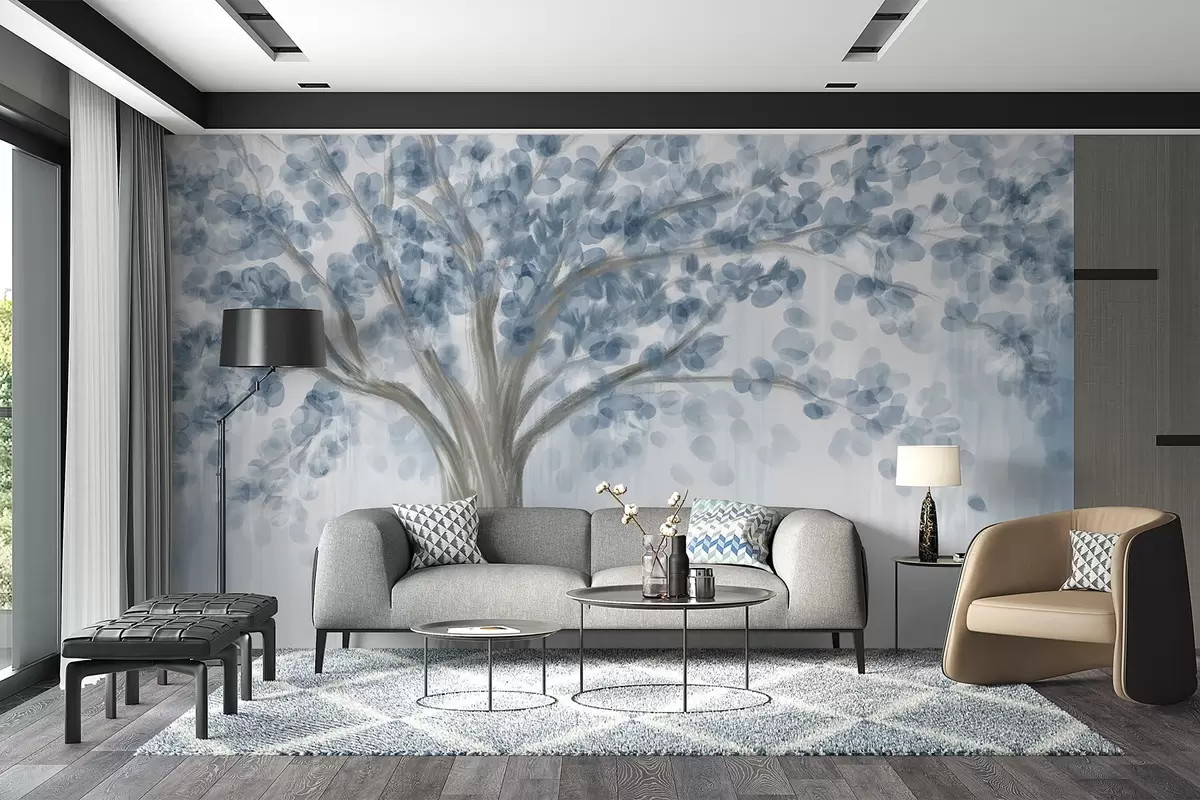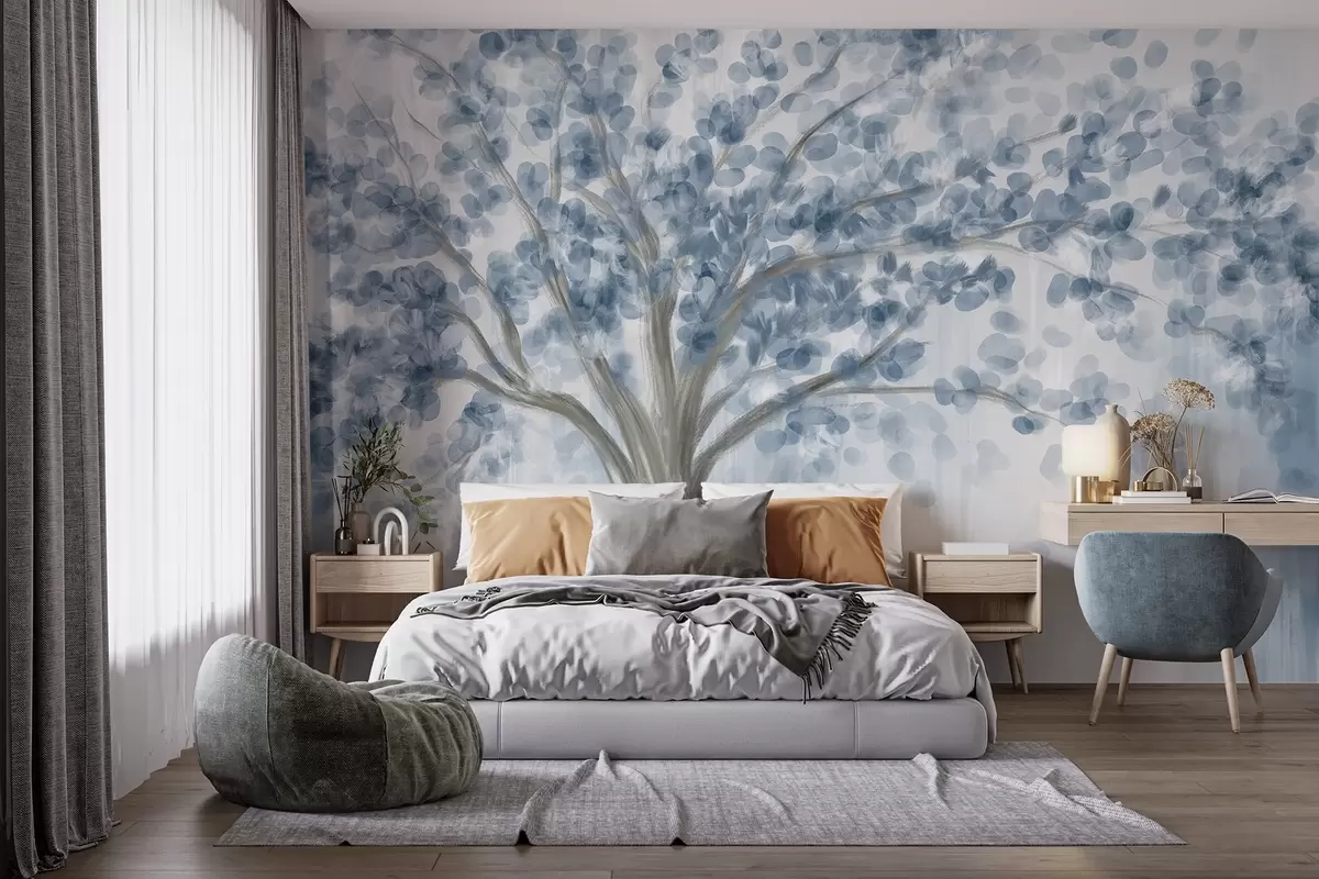 Fototapet Un copac mare cu frunze moi, abstracte, în albastru, pe un fundal ușor, neutru, care accentuează tonurile copacului Nr. w08669v1