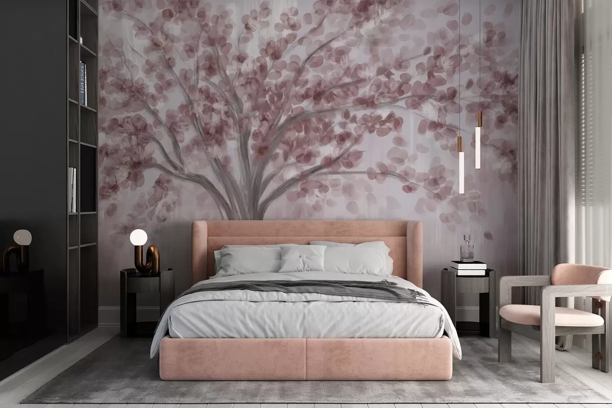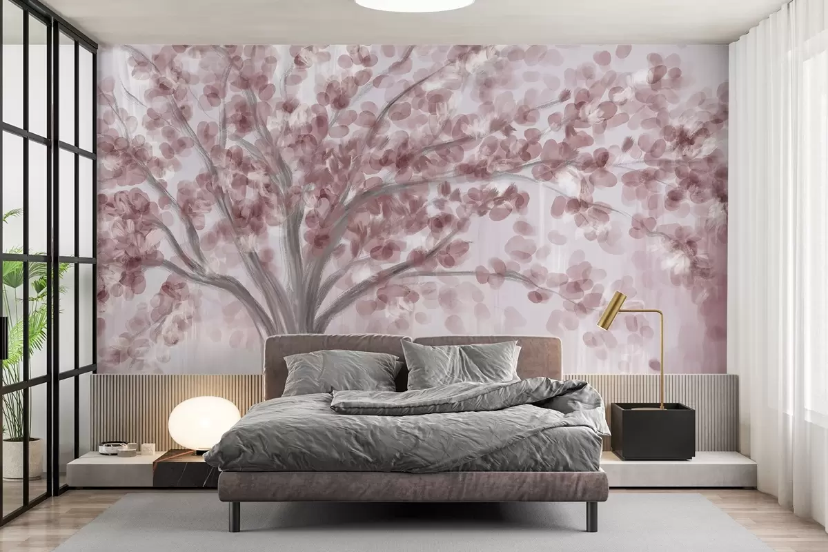 Fototapet Un copac mare cu frunze moi, abstracte, roz, pe un fundal ușor, neutru, care accentuează tonurile copacului Nr. w08669v2