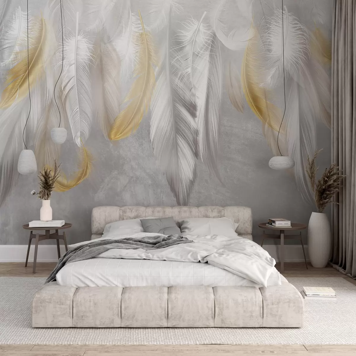 Fototapet Pene albe și galbene agățate pe un fundal gri moale, creând o compoziție delicată și aerisită Nr. w08670