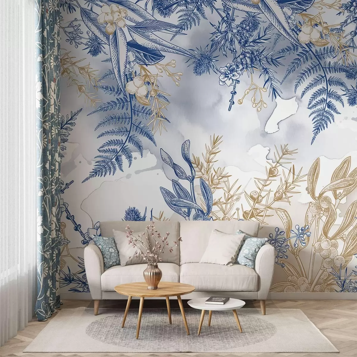 Fototapet O imprimare florală cu elemente botanice albastre și galbene, pe un fundal ușor, moale, cu efecte de acuarelă Nr. w08671
