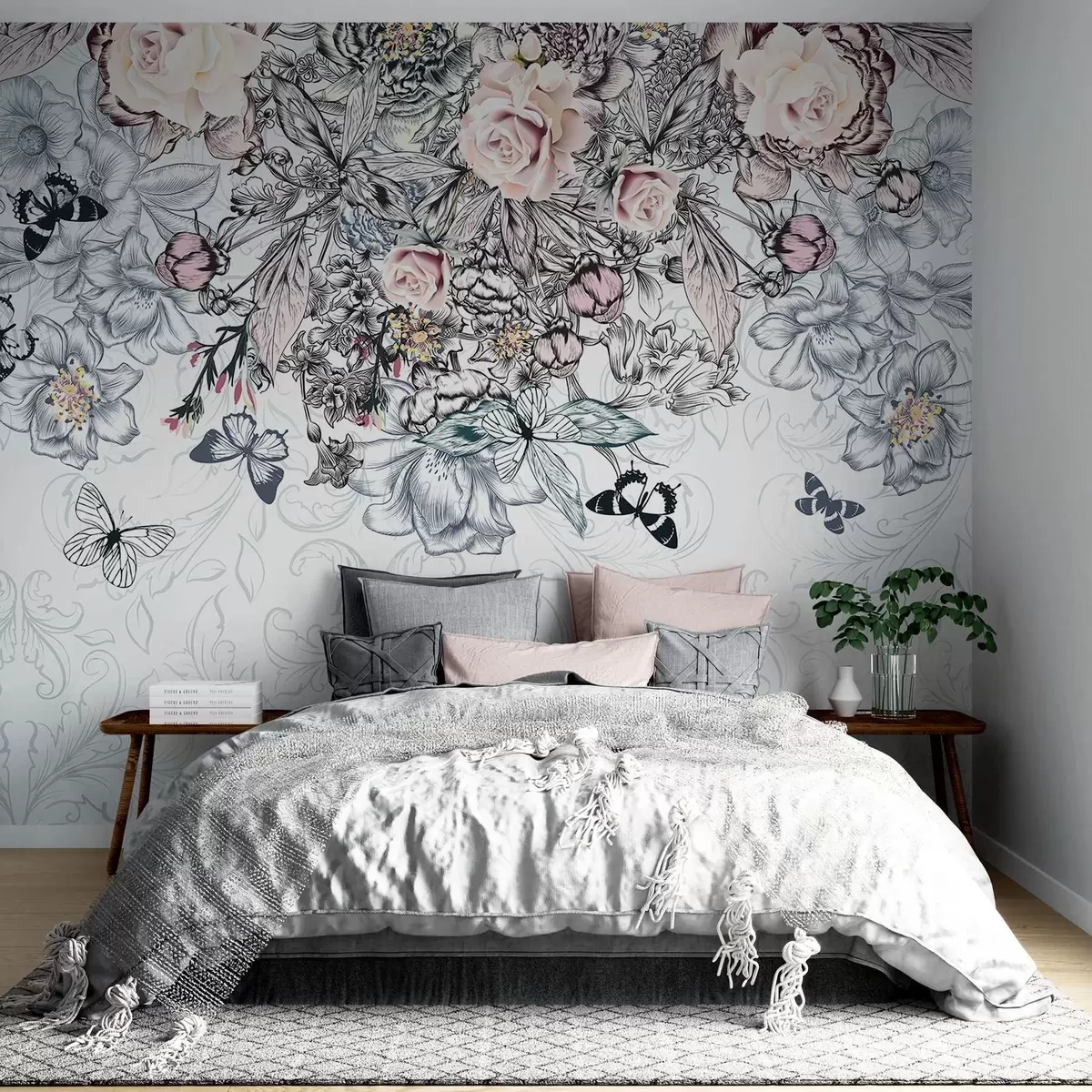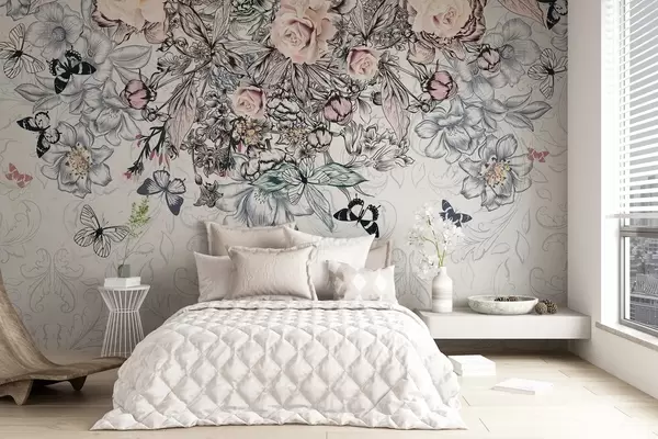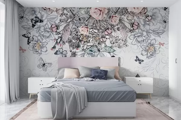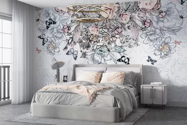 Fototapet Un desen floral cu trandafiri roz și diverse flori și fluturi cu artă linie complexă pe fundal texturat Nr. w08674