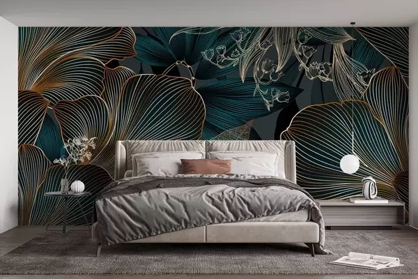 Fototapet Flori și frunze stilizate cu linii complicate în nuanțe de albastru și galben pe fundal închis Nr. w08675