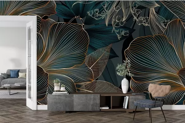 Fototapet Flori și frunze stilizate cu linii complicate în nuanțe de albastru și galben pe fundal închis Nr. w08675