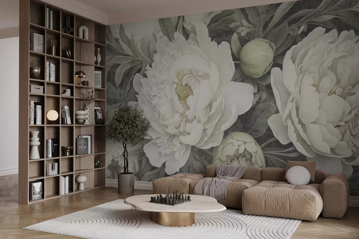 Fototapet Peonii albe pastelate texturate cu boboci și frunze verde moale cu petale delicate Nr. w08697