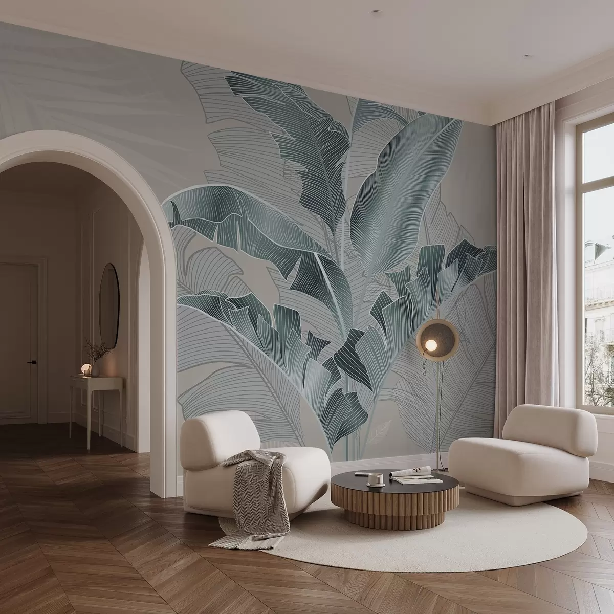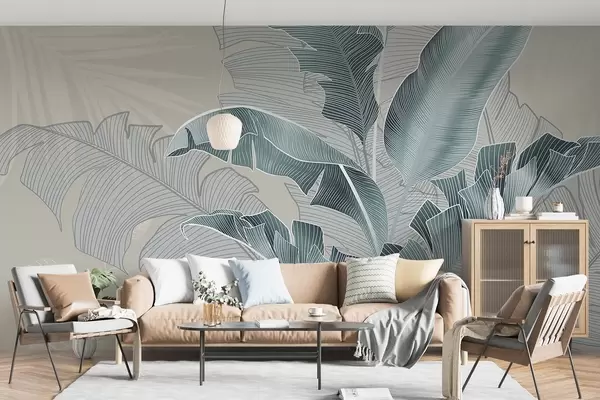 Fototapet O compoziție armonioasă de frunze tropicale în nuanțe de bej și turcoaz, cu linii detaliate Nr. w08698v1