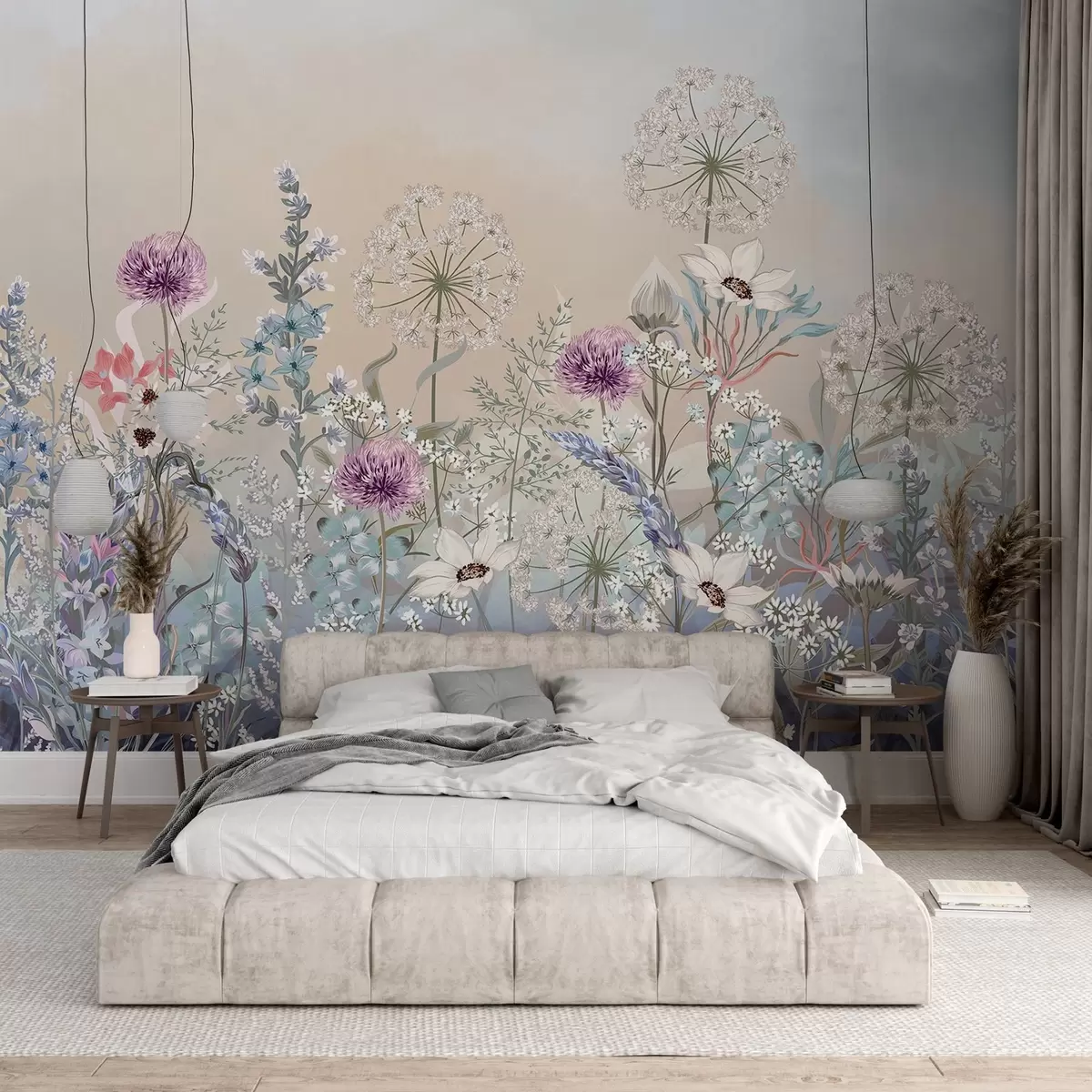 Fototapet O grădină florală vibrantă cu diverse flori și iarbă pe un fundal texturat de gradient de culoare pastel moale Nr. w08699