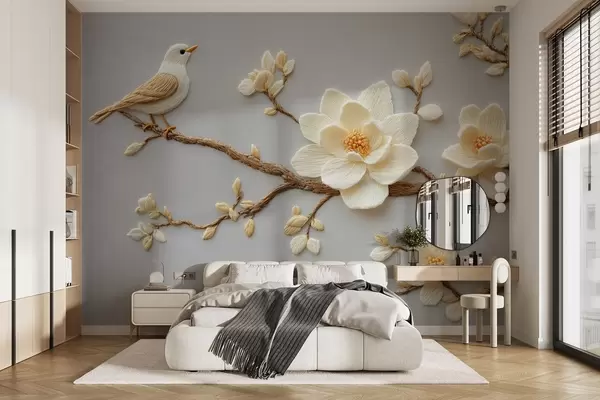 Fototapet În stilul florilor de magnolie brodate cu o pasăre pe o ramură pe un fundal albastru deschis Nr. w08724