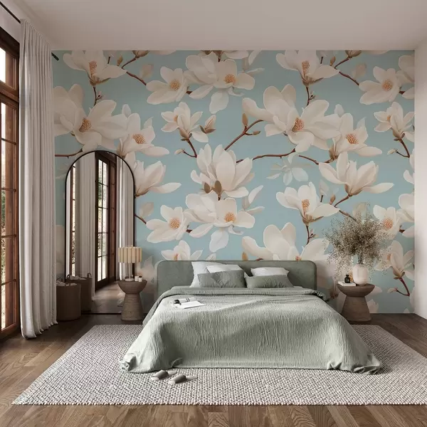 Fototapet Model de flori de magnolie albe, fundal albastru pastel, frunze și ramuri albe Nr. w08726