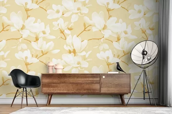 Fototapet Model de flori albe de magnolie, în nuanțe de galben, frunze și ramuri albe Nr. w08726v3