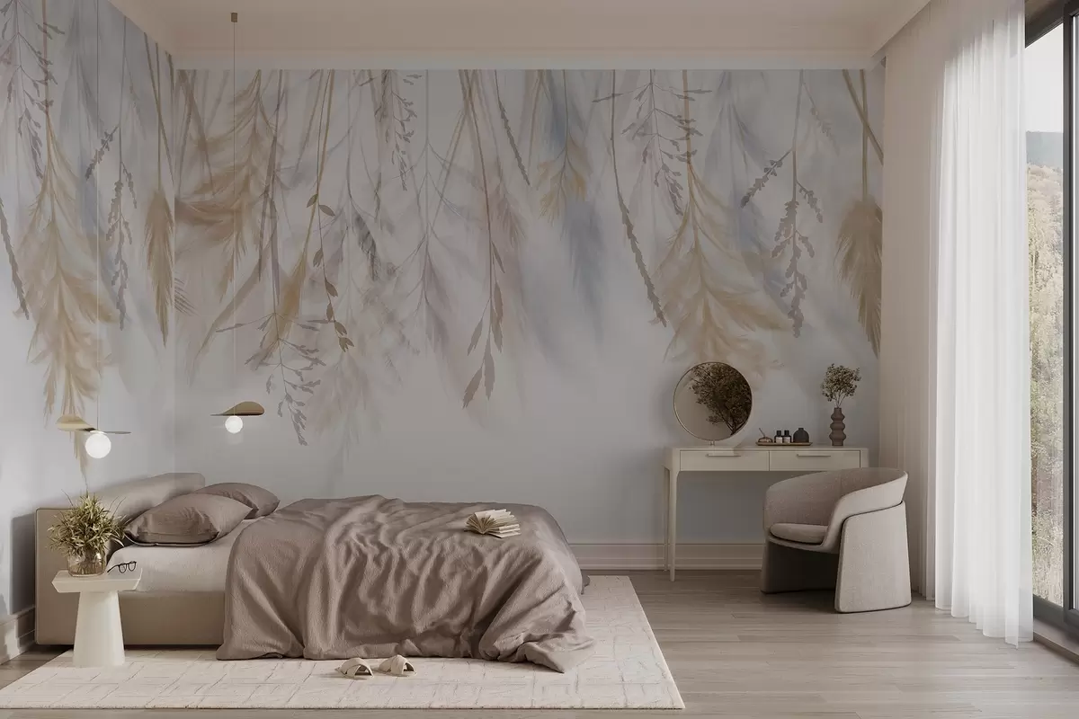 Fototapet Ierburi delicate, spikelets și plante în tonuri pastelate, aranjate în cascadă pe un fundal deschis Nr. w08737