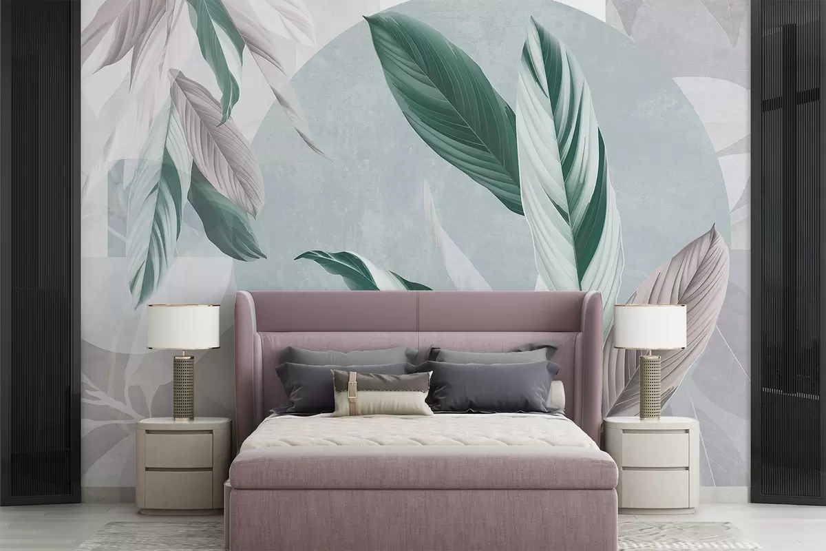 Fototapet Compoziție texturală geometrică modernă și abstractă cu frunze detaliate în nuanțe de verde, violet deschis și alb Nr. w08741v1