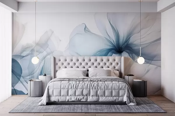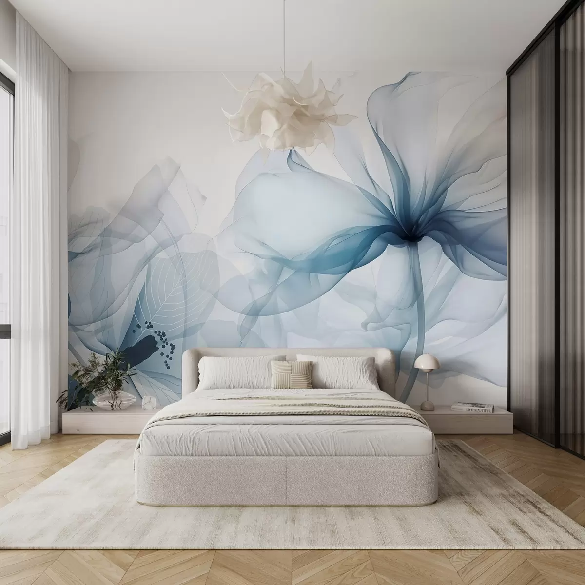 Fototapet Flori abstracte albastre cu petale moi, translucide și detalii delicate, pe un fundal alb Nr. w08742
