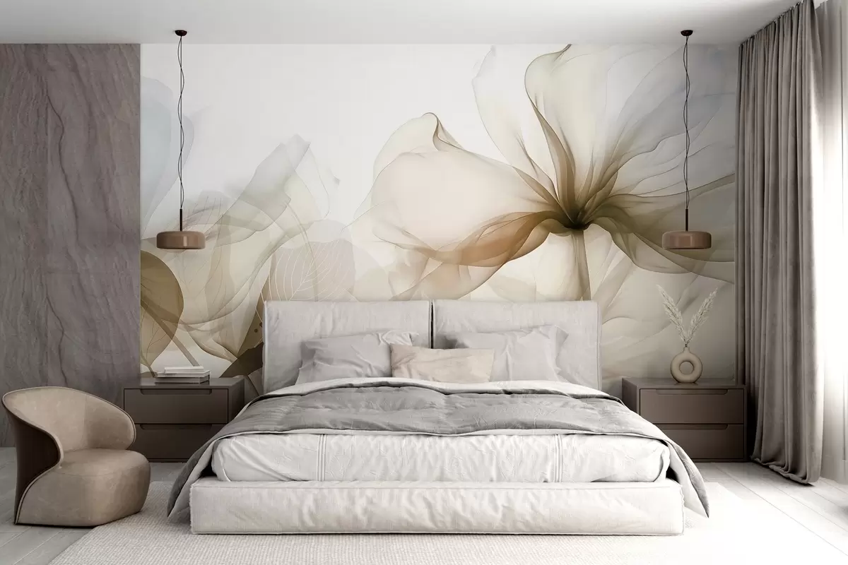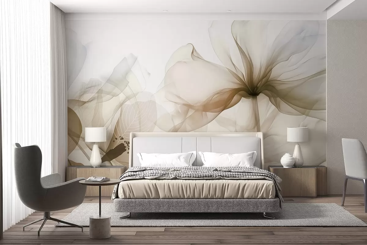 Fototapet Flori abstracte maro, cu petale moi, translucide și detalii delicate, pe un fundal alb Nr. w08742v1