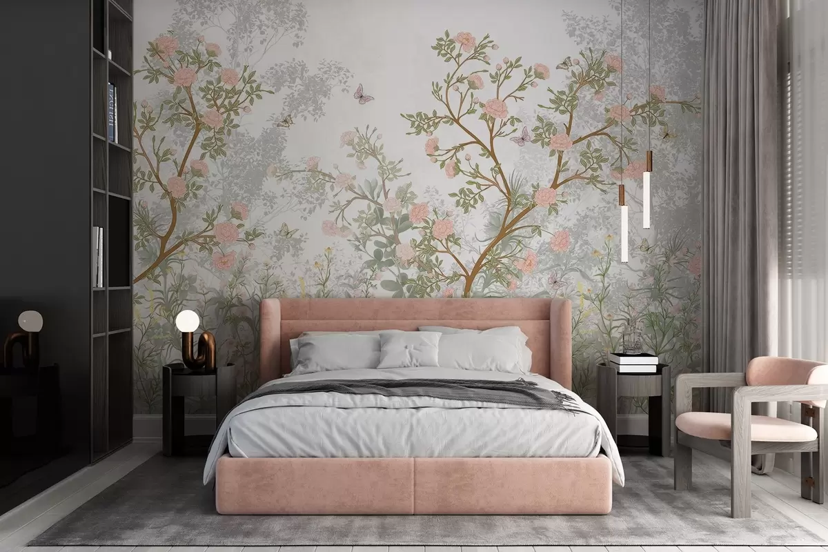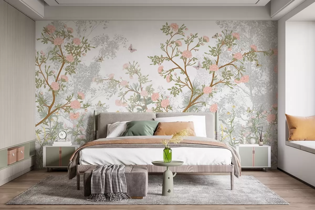 Fototapet Copaci delicați cu flori roz, fluturi zburători și frunze verzi împletite cu ramuri subțiri Nr. w08744