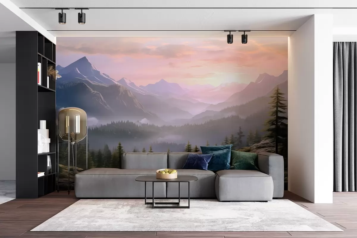 Fototapet Peisaj montan senin în zori cu ceață moale pe fundalul unei păduri Nr. w08750